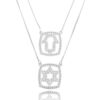 O colar é feito em liga metálica com banho de rodio. A corrente é veneziana bem fininha. O pingente tem altura de 1,5 cm e largura de 1,3 cm. Cravejado por cristal esmeralda fusion envoltos por camada de zirconias brancas. O comprimento da corrente é de 38 cm, mas pode ser também usado a 43 cm.